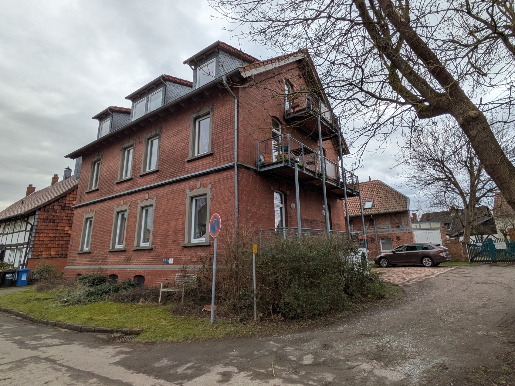 Aus diesem Blickwinkel ist das Vorderhaus mit Balkons gut zu sehen, rechts im Hintergrund ein Teil des Hinterhauses mit der Zufahrt und Stellplätzen.